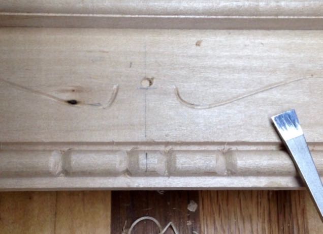 Knowing this would be difficult to carve due to the profile the design needed to be kept simple; that’s when the sgraffito inspiration hit me. Searching through web images yielded a design I thought would work. By experimenting with the size I decided two different sizes were needed to make a pleasing layout and the best tool to get there was this long bent V-tool, 6mm. Keeping focused on the size of the piece curling out from the tool is what I used to gauge the depth of the cut.