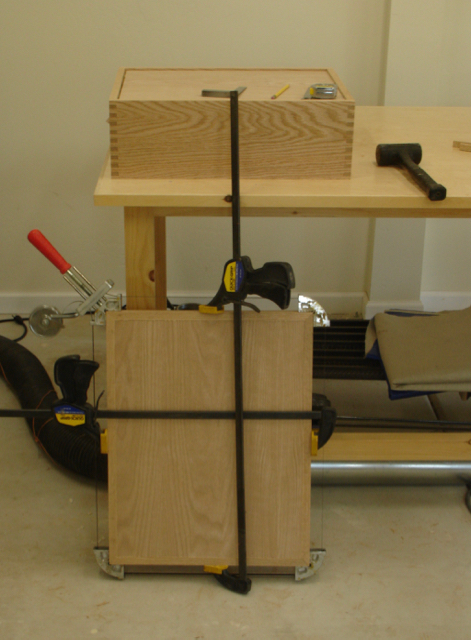The box was clamped up to size the bottom piece which is 1/2″ Oak plywood inserted into a dado for strength. The top is a straight forward lift off one also made of the Oak plywood and then banded with a mitered piece of solid Oak. Next up is sanding the interior and gluing the pieces together and it should be ready to ship out by the middle of next week. It’s been some time since I last worked with Red Oak — forgot what a nice smell it puts into the shop while it’s being worked!