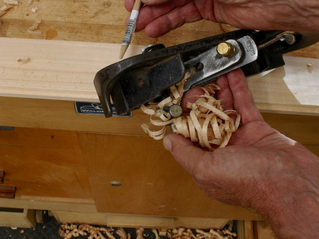 The Lee Valley small Plow Plane has proven to be a real delight now that the depth stop issue has been resolved.  The shavings just curl effortlessly out of the tool as you can see in the lower right hand picture.  Unfortunately, the same can’t be said for my 30’s era #78 Stanley Rabbet Plane.  The shavings tend to clog up but were easily cleared with the use of a sharpened dowel.  The other thing I discovered is that it is no longer a true 90° so the resulting rabbet isn’t square.  I’ve trued up the bottoms of planes before but in this case besides being flat it’ll also need to be exactly 90° to the side.  That’s a problem for another day.