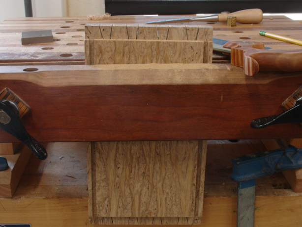 Believe me, after 2 attempts I was convinced that dovetailing the Flame Oak wasn’t going to happen. I had very little problem making the saw cuts but removing the waste between the tails and then trying to chop out the pin boards proved to be undoable (is that a word?). With that beautiful burl like grain going in every which direction a smooth chop or cut didn’t seem possible. The chisels were re-sharpened and honed but to no avail. Each attempt took almost 3/4″ off the length of the boards so I knew I needed to go to plan B which was to rabbet the corners and use dowels to hold them together — I’ll save that for the next blog.
