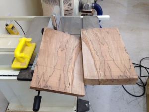 I looked around through the meager wood supply I had (much was given away prior to our move) and found a choice piece of Spalted Maple and also some Wenge. The size of these pieces determined the size of the box but also added some stress to the project knowing that if I made a mistake or the wood decided to crack or show some flaws there was no extra material or back up plan. The Spalted Maple yielded enough 5/8″ thick pieces for the sides and top — awesome seeing that figure appear with each slice! After running it through the planer the surface was finished off with a smooth plane. The Wenge was then cut in half and; you may notice, a slight chamfered cut was made on the outside of each piece. This created a little bit of cathedral grain on the sides of the box. That wood tends to splinter and not plane cleanly no matter how sharp the blade was or how tight the mouth of the plane was adjusted to — sanding required on this piece of wood.
