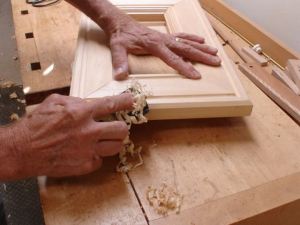 Unfortunately no one carries any 6/4 Basswood here in town so buying the 8/4 meant a lot of waste. I do need that thickness for the other frame so not a total waste. The lumber was purchased at Timbers in Mesa and I ask them to sweeten one edge since I don’t have a power jointer — my #7 Stanley works well though; yes. I could do the whole process with it but sometimes it’s worth a couple of bucks to have them start it. The edge they gave was fairly square but nowhere as smooth as a hand plane will get it. As you can see in this picture, the board needed to be flatten which was done with my shop made scrub plane and winding sticks. Now they could be run through the power planer to the required thicknesses. I won’t bore you with the step by step details of milling this profile but basically after the stock was brought to thickness it was first ripped to width. Then the sight edge is cut on the router table followed by the two passes to route the grooves. There is also a slight chamfer on the outer edge which is initially cut on the tablesaw then planed smooth after assembly. The frame for my client is only 4″ x 6″ and so not to hide too much of the painting behind the rabbet it’s only about 3/16″ deep. When routing grooves you’ll find that one side may be rougher than the other which is due to the bit cutting against the grain on one side of it and with the grain on the other. A tadpole sander is the remedy for that.