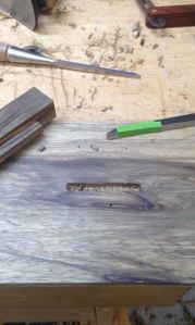 The final hand work on this box was to mortise in the handle. Since I only have a 1/4″ mortise chisel (but Christmas is coming!) that’s what I use for lids. After selecting a cut off piece from the box the tenon is roughed out on the tablesaw with a rip blade, usually this piece of wood is too small for hand planing so it’ll be cut slightly oversized and fine tuned by pulling the piece of wood over a rabbet block plane.