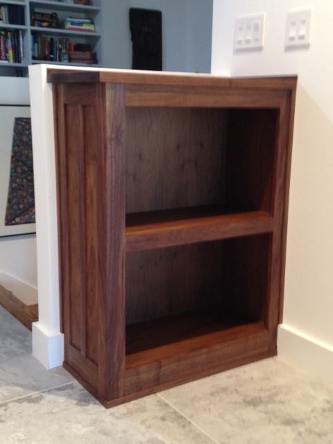 When I took the top back to the job the second day my client had given me a key since they would be gone. Nervous anticipation doesn’t begin to describe how I was feeling and honestly was glad they weren’t there in case my calculations were off. Yes, success — the top fit just as I had hoped. After attaching the bookcase to the studs and attaching the top the scribe strips were cut on their stairs using a razor saw and bench hook — old school. Once done I texted the clients with a picture of the unit in place. Later that evening they texted me the picture you see here with the bookcase already filled with all of their art books. I think that means they were excited to get it!