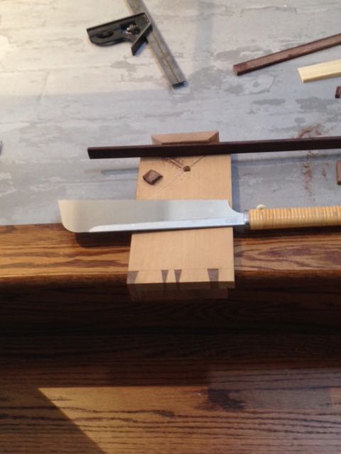 The top was left longer than required so the first step was to cut it to length. You know that expression: “measure twice, cut once”; well with all that was at stake I measured, checked, and double checked — twice! First was to set the sliding table to match up with piece of foam core, surprisingly this was only about 91°. This was confirmed by raising the blade and running that foam core with power off. A second check was then done with the wood, I knew there was a 1/2″ difference in the width from one end to the other. Here’s a photo essay of the process: