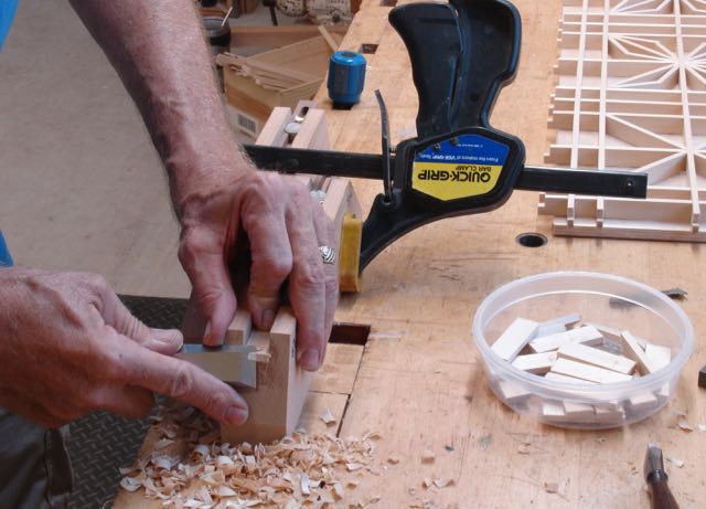 I’ll pass along something that I’ve found helpful with the Kumiko work. After dry fitting all of the wings the next step is cutting that little key that’s cut at 45° at both ends. One end fits in the corner and the other goes into the 2/3 pocket cut at 67.5°. This project called for 12 of them and you’d think they should all be the same length, well; almost! My method is to get adjust the jig for a good fit and then try the in each location. If it fits fine, if it’s too long a bit more needs to be taken off the end. For me it’s tricky to hold that small piece out and trim both ends equally to maintain the point. Some type of shim was needed so I took an old feeler gauge set for setting spark plugs, trimmed it so it will lay across the jig, and used that — works like a charm!