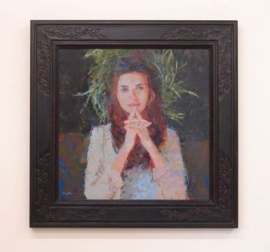 The carving on the frame though fit the foliage behind the models head, I blogged about the creation and carving process on this frame in detail here, they are olive leaves and olives. If you follow the link to see the original painting and frame and then compare that to this detail of the do-over frame and new painting I think you’ll agree with the changes. I feel that the purpose of a frame is to isolate the painting and put it into its own world. Then it should complement the palette and brush strokes of the artist. Notice the undertones of red, a gilded frame didn’t work with that at all!