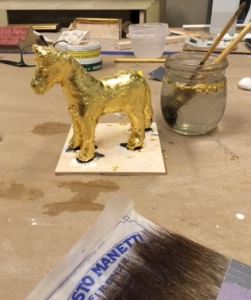 Like most everything else, final results are based on the preparation you put in before hand. Think in terms of building a house, if the foundation isn’t level, square, and solid the house won’t be either! When gilding with precious gold leaf there is a base that needs to be applied first. For the workshop the item we gilded was a small, papier-mache horse. The base coats are called gesso and it’s an artful process on it’s own — if it’s not done with the correct ratios it will fail. Essentially this is a mixture of whiting (chalk), rabbit skin glue, and water. We spent most of the first morning discussing the different ratios used for either hard or soft gesso and their purpose. Another part of the morning was spent discussing clay, rabbit skin glue, and gelatin; all of the ingredients need to be carefully measured and prepared using a double boiler and a kitchen scale that measures in grams. Charles put a sequence of photo’s on his Instagram to illustrate me making the gesso; looks like I’m getting ready to bake a cake!