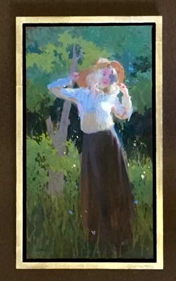 To my way of thinking, a picture frames purpose is to isolate a painting from the rest of the world and subtlety complement the work of the artist. When I design a frame I observe the palette and mood of the painting and try to have the frame reflect that in some way. Being what I refer to as a “boutique frame maker” coming up with a challenge for myself is another aspect of the design process. Quite often, a client will tell me to just use whatever molding I have but the thing is — I don’t have pre-made moldings! Somewhat like a restaurants by-line, we don’t make it until you order it! This painting is by Diane Eugster and the frame has been in progress for quite some time. The title is Beneath the Trees. This is the first time I’ve water gilded a floater style frame, it’s in 12 kt. gold leaf. The story behind it is that it was initially ordered by a client as a 12″ x 24″ but there was a defect in the wood I hadn’t noticed until it was time to join it. I must be blessed because a day after noticing it she called and asked if it was too late to cancel that part of the order — her painting for it wasn’t working out. No problem I told her and asked my wife if she wanted an undersized panel and you can see the results. Definite challenges doing the transition from the gesso and clay surface to the inner black surface but it was a good learning exercise and we (Diane and I) believe it came out nice in the end.