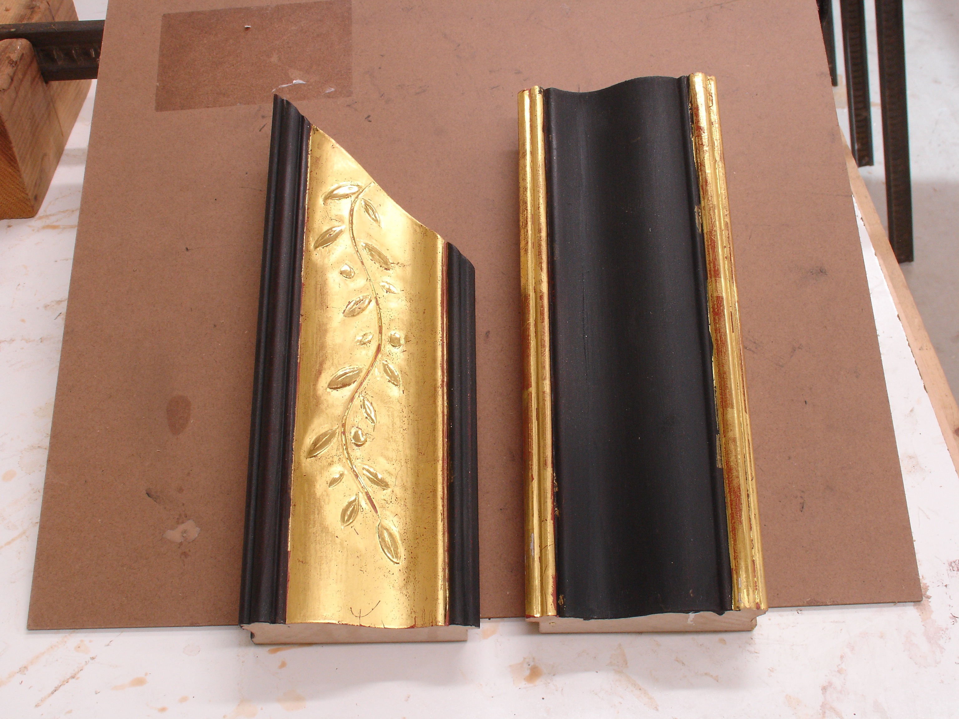 Definitely keeping busy, how in the world did I ever find time to work a “regular” job? Our house has a bigger yard which requires more maintenance than we’d planned on but having a separate studio for Diane and a free standing shop for me more than makes up for that. Continuing to experiment and try to hone my water gilding skills after taking the workshop from Charles Douglas. These two sample pieces feature 23kt. gold leaf with slightly thinned Japan Black to offset the gold. The carving is a sample piece for a client. The molding is the profile made for me by Barger Moulding here in Phoenix, just re-0rdered from them. That design allows space for carving and is pretty traditional, I really enjoy creating my own profiles whenever possible.