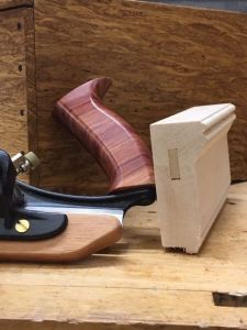 This is one of the more interesting profiles I’ve created. It’s a two piece design and the beads are formed using a Veritas small plow plane with beading cutters installed . When I posted this picture on Facebook, it got lots of response. Probably as many asked about the plane and box as did about the moldings! If you’d like to know more about the plane and the box here’s a LINK to the creation of it. To make this profile I used 1-1/16″ Basswood that I get from Peterman Lumber. The outer piece has two, 1/4″ beads plowed into it and then the groove is cut for the spline. The groove for the panel is cut at the same setting on the tablesaw. The panel has one bead which is set back a bit from the edge, it’s trimmed at an angle later. The critical part is to locate and cut the angle on the outer piece so that it aligns perfectly with the thickness of the panel. Trial and error with a protractor is how that’s figured out — no CNC or computerized gizmos for me! Forgot to mention that the panel is finished with a smooth plane prior to cutting the bead. The rabbet is cut after the pieces are joined to leave a lot of surface so they can be clamped sight edge to sight edge as shown below. The size of this frame is 16″ x 20″. The spline is MDF to eliminate any concerns about movement as there would be using wood.
