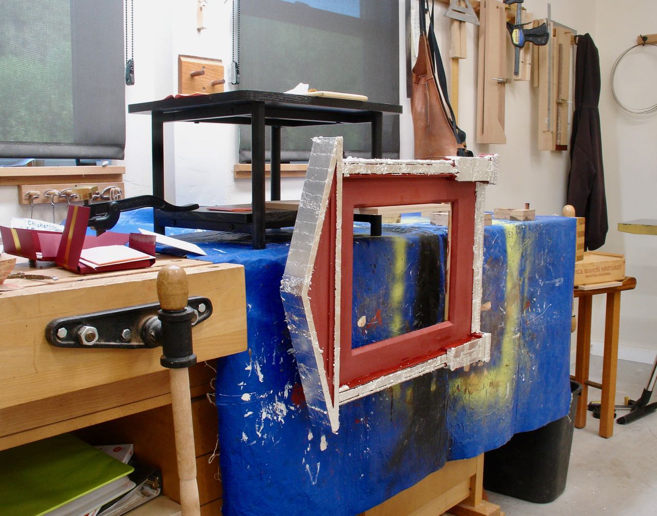 After a base coat of red burnisher/sealer from LA Gold Leaf  the frame was oil gilded with 12 karat genuine gold leaf.  Overall the frame measured about 21″ x 25″ and there are several different levels that needed to be gilded.  To avoid having pieces of leaf fall on the area around the sight edge, the process was broken into 2 stages. The first day gilding was done to the outside edges, columns, pilasters, and roof top.  The next day the remaining frame was gilded.  This picture shows how I ended up positioning it to reach all of the crooks and crannies!  This is at the end of the first day.  After allowing the oil size to cure fully the leaf was very lightly rubbed back and the entire frame is protected with two coats of platinum blonde shellac applied with an air brush.  The final step is to apply some Liberon wax with a white scrubby, this evens out and takes that shiny shellac finish down to a nice matte finish.