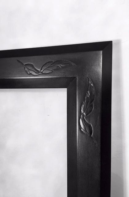 The finishing process could be a complete blog on its own. I find it’s pretty experimental. For this frame I decided to go with a spray on primer rather than the usual burnisher/sealer which is very thick and would probably obscure the shallow carve. This was followed with a satin black. Careful rubbing back with cotton balls and wax created the finish I wanted — subtle red peeking through at the corners of the frame. At first glance you barely notice that the frame is carved so just like with Diane’s work the intricacies and beauty needs to be discovered by the viewers.