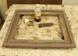 This painting was on a panel so the first thing needed was to glue 1/4″ plywood to the back of the frame so it could be attached to the frame with screws. On a smaller piece a simple rub joint would be sufficient but this is 20″ x 24″ so decided to play it safe and clamp them in place. There are oversized holes in the frame so the painting can be centered, I use #6 screws for this process. I’m a big fan of gimlets to pre-drill the hole in the back of the painting — very little chance of going through to the artwork!