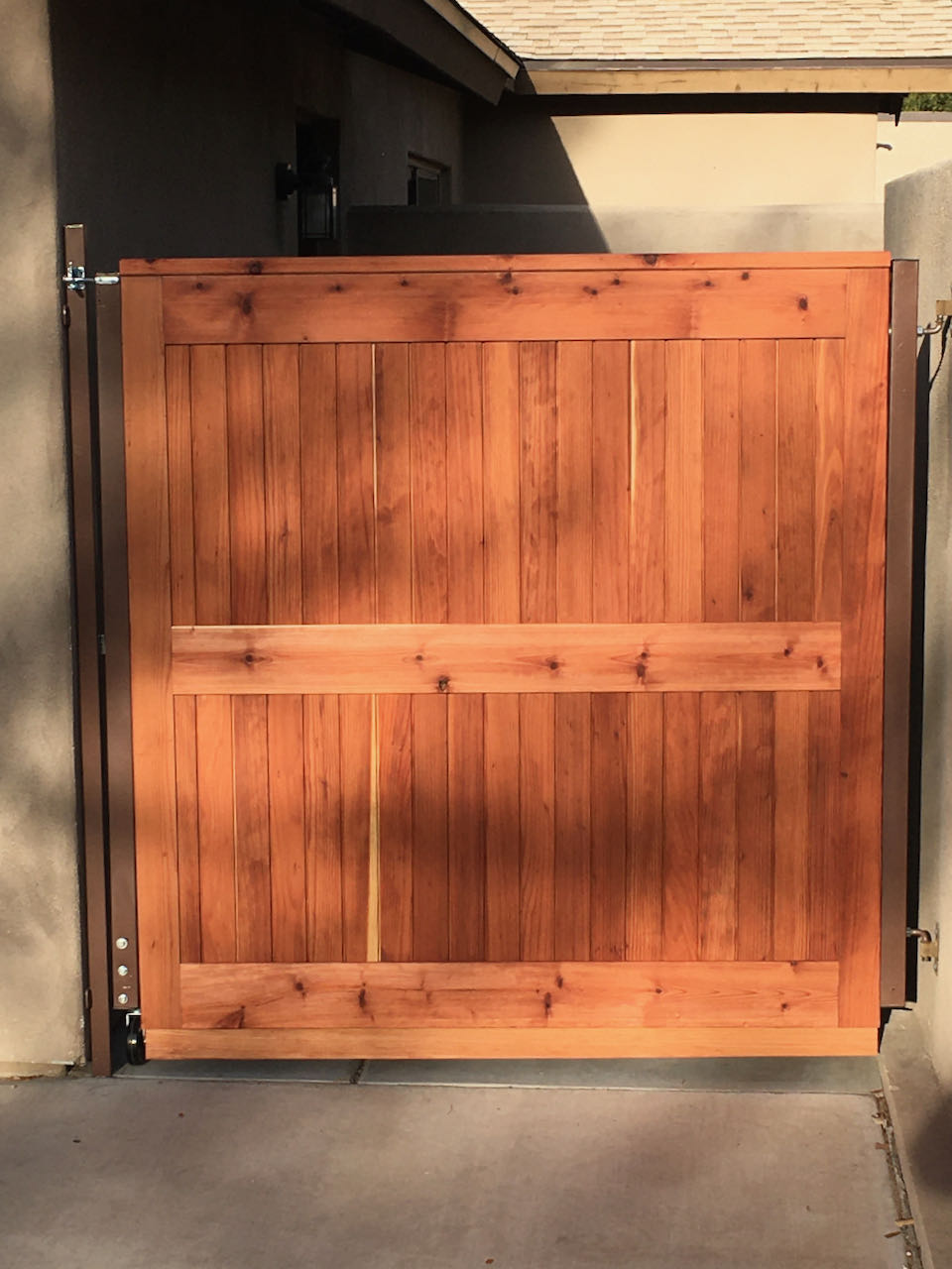 Here’s a view of the back of the gate, notice there are two pieces of Redwood at the top of the panel. The top one was glued/screwed to the top of the panel and rests on the metal framework. The bottom one is screwed to the top and essentially wraps around the metal frame. The entire panel was finished with Thompson’s waterseal first. The back of the hinged side needed to have mortises chiseled out to clear the hinges and nuts. Screws through the metal framework of the gate secure the overlay to it.