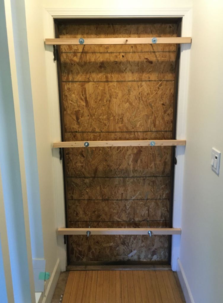 The first picture shows how the house was secured with a piece of OSB plywood using long carriage bolts that go through the 2×2’s and tightened against the door frame. Needed to create a temporary weatherstrip at the bottom out of some rolled up paper towel! The next two pictures give you an idea of the stripping process. I did some experimental sanding to see how that would look and judge how many times the stripper would need to be applied. Using brass brushes after getting most of the “goop” off with the scrapers worked really well. Most of the surfaces needed 4 applications of the paint remover. The final picture is of the hardware which was cleaned with steel wool and denatured alcohol and then sprayed with Rustoleum flat black.
