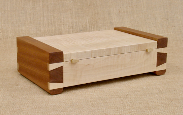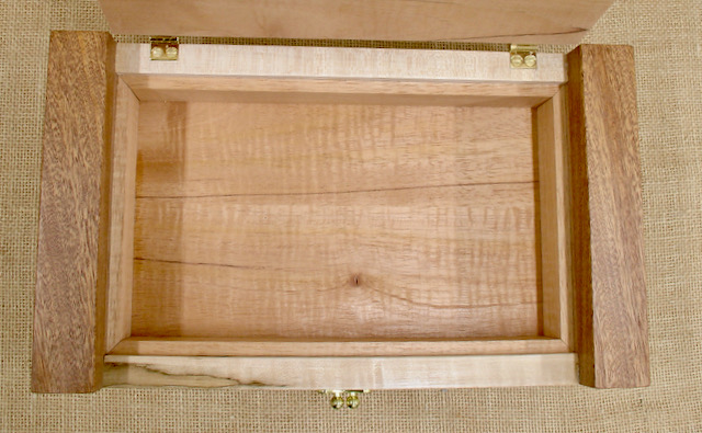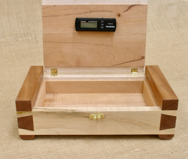 The subject of making a custom cigar humidor recently came up when I was talking with the owner of Creative Gateway Gallery. They have galleries in Scottsdale, Phoenix, and Sedona. He mentioned that cigar art was popular and suggested that perhaps designing and building a humidor based on my box technique may be a good addition for the gallery. This led to me to doing some research, online and talking to owners of cigar lounges. A requirement for a humidor is that it’s lined with Spanish Cedar which is the best material to control the humidity requirements of cigars and also that the box has a good seal. It’s up to the owner of the humidor to “season” the inside and maintain the humidity. What you see in these pictures is the result of that, my interpretation of that traditional humidor. I used a piece of Curly Maple for the top, front, and back and ribbon grain Sapele for the sides. Hand cut dovetails are both decorative and allow for strong box construction.