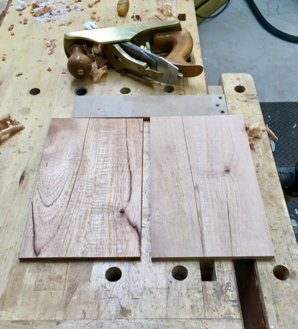 I found a piece of Spanish Cedar at Woodworkers Source that caught my eye because it seemed to have what’s referred to as a “fiddleback” pattern. It was 4/4 so after resawing it I was able to get 5/16″ thick pieces for the sides and laminate them for the top and bottom. No finish on these but look at the beautiful grain pattern after using my smooth plane on it — stunning!