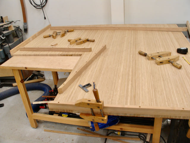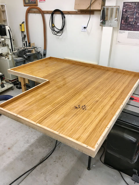 Construction was typical so I won’t bore you with the details. The granite wasn’t square so I scribed it in place and used a small trim saw with a straight edge to cut it. Jointer planed to smooth the cut and then edged it with 1 5/8″ wide strips of the Bamboo. This was glued and screwed into place.