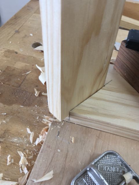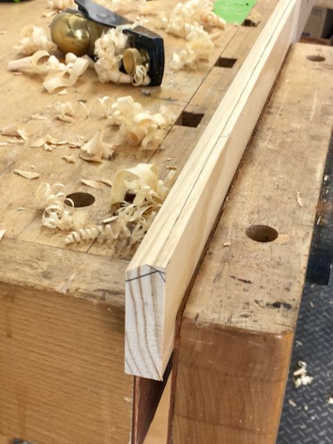 With the bottom shelf on my version not going the full width and a at different angle things were different but in a good way! During a dry fit the shelf was inserted into the stopped dados and then marked on the ends. Those lines were extended the length of the shelf and this gave me an opportunity to hand plane a chamfer. If you’re a hand tool woodworker you understand when I say this was fun! I used to teach my junior high school students how to use a block plane to cut chamfers and rounds and this reminded me of those times.