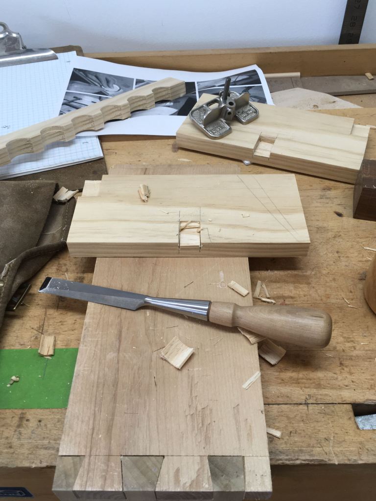 Only two measurements were given; 8″ for the side pieces and 17+” for the pieces between. What I did was count how many chisels I was using for the current project, checked to see how much material I had and decided that 13 was a good number — I used dividers to step off their centers much like you do for laying out dovetails. Bob cut a series of stopped dados for this project so I followed suit. Didn’t have enough material for a full shelf so that too received a stop dado. My angle is about 35°. This was a good exercise in hand chiseled dados and my Stanley 271 router plane insured all of the bottoms were the same. Trick holding the wood for these routers but here’s how it was done, bench hook works to hold this small piece.