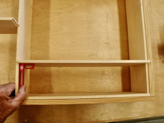 After the case was assembled the outside and front edge were finished with Osmo Polyx oil. The inside was left unfinished since the liner is glued and clamped to it. I used Basswood and painted it with a blend of Casein paint that I use on picture frames. Only the show side and front edge were painted which resulted in some cupping. That was a concern but by using a lot of parallel clamps to hold it down while the glue set seemed to work. The liner was sized to allow space for the 3/8″ thick shiplap plus a French cleat at the back and the front was set back about an eighth of an inch to create a shadow line. The dividers are 1/4″ Basswood and were assembled using a 3/16″ blind dado cut with a router. The method used was to measure the distance the bit cut from the base of the router. I then cut a piece of MDF to the distance of the dado from the bottom of the divider minus the space for the router. This way it was possible to ensure the distance was exactly the same on both sides. The cut starts at the back and stops about 1/2″ from the front. The tongues were cut using a skew rabbet plane after carefully sizing them to fit between the dados with a shooting board. The tongues were then trimmed and everything went together squarely.