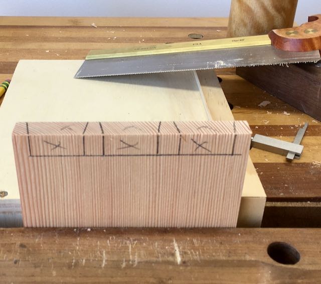 Vertical grain Douglas Fir has always been attractive to me, my earliest memory of it is in the mid-60’s as a teenager working in a local lumber yard where it was commonly used then for bullnosed stair tread material. It can be tough to work with since it tends to be “splintery” which I found out. After prepping the material primarily with a Stanley No.80 cabinet scraper it was time to cut the dovetails. Matt showed a technique using a special Forrest blade which cuts the dovetails and requires careful set up of your table saw. I prefer the quietness of hand work so always cut mine by hand. Within the last year of so I opened my wallet up for the Knew Concepts coping saw to cut the waste. After seeing so many others use it thought I’d give it a try. There is a learning curve and for me it works best if I deepen the scribed baseline with a chisel before using that saw. I also use my skew rabbet plane from Veritas to cut a shoulder on the tailboard like the old Stanley 140 trick. This helps to line things up when you transfer to the pin board and leaves a clean, inside corner.