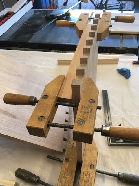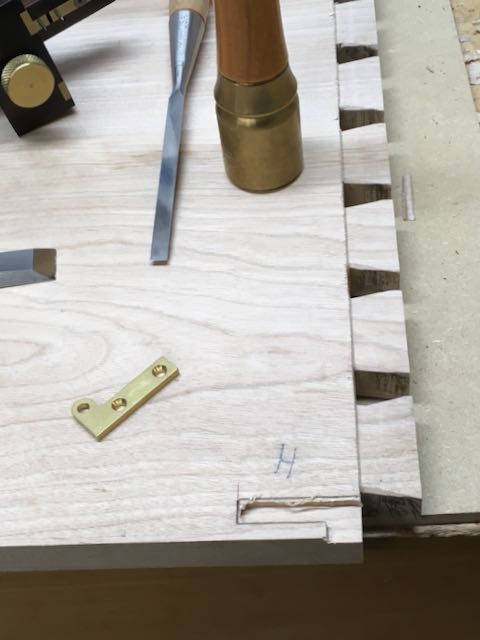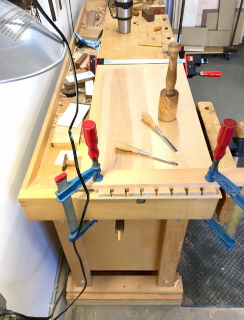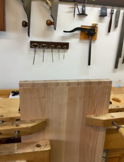 Every step of the project became a hassle due to that cupping. Reminded me of starting my carpenter apprenticeship after Nam; my first boss always stressed that if we screwed up on the foundation we’d be fighting it every step of the way and he was right. It’s been a long time since that I’ve made this many dovetails on a project (8 tails) so this became a personal challenge. That cup threw the layout off so things didn’t fit “right off the saw”! One thing that helped somewhat was clamping a caul to the panels when transferring tails to the pin board. I also used that when glueing the piece up. Since this is a personal piece for me I can accept the results, if it was for a client I’d have to start over. Here’s a collage of the process.