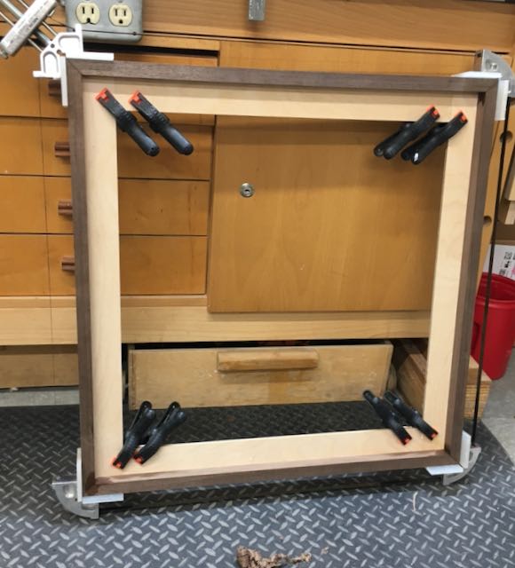 The second floater frame, also a 24″ square stretched canvas is different in that it’s made of Peruvian Walnut. This painting is titled “Break of Day”. The process is essentially the same but the finish for natural wood is different. Also, instead of using biscuits to reinforce the miters there are pieces of the walnut splined into the corners. That process is done on the table saw equipped with a rip blade and a special jig. The finish is two coats of Osmo Poly #3043.