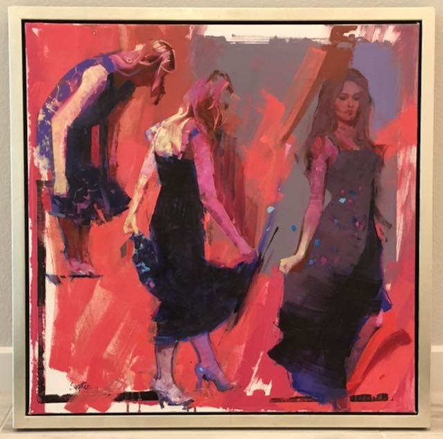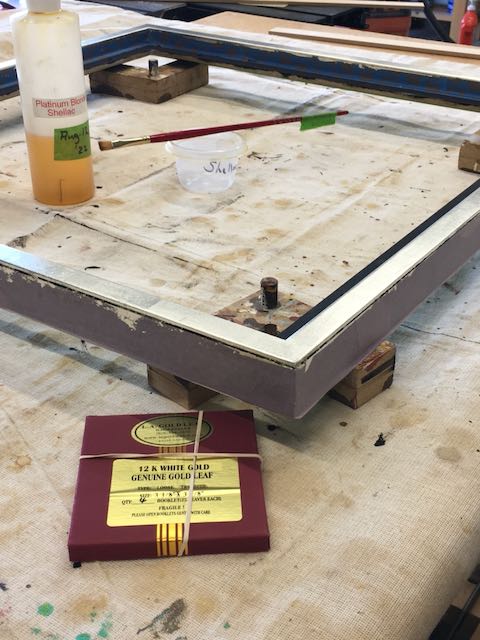 This frame is for a stretched canvas measuring 24″ x 24″. Diane has titled this painting “Strut Your Stuff”. The frame is made of Basswood which has been gilded with 12kt genuine gold leaf. The sides are painted with drop black, Japan paint. The leaf is oil gilded and sealed with a platinum blond shellac which I mix from flakes. It gives that white gold a warm glow while protecting it from tarnishing.