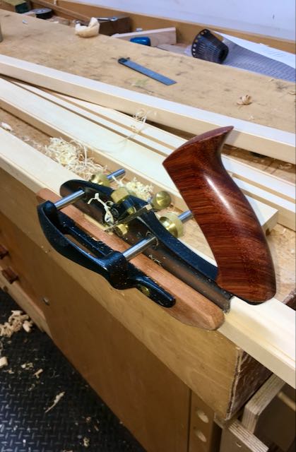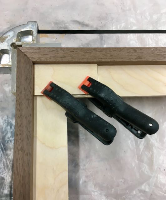 I use 1 1/16″ thick Basswood which I buy from Peterman Lumber here in Las Vegas. I made one minor error on this frame! Many times I’ll let the width of the wood dictate what the size of the frame members will be, this is to utilize the wood with a minimum of waste. I had a board slightly over 6″ wide so it made sense to make the 4 frame pieces about 1 1/2″. The error I made was that to use face frame biscuits in the corners the pieces should be a minimum of 1 3/4″; argh — so many little things to keep in mind! The way I make these frames is unlike the commercially produced ones which are usually just an L-shaped molding. The montage below shows my design which has a 1/4″ dado which holds the painting. I can cut this wherever I want and it also reinforces the corner joint. The upper edge is profiled using a beading cutter in my Lee Valley small plow plane. Somewhat tricky cutting 2/3’s of a bead but this gives a definite separation between the paint and the gilded surface.