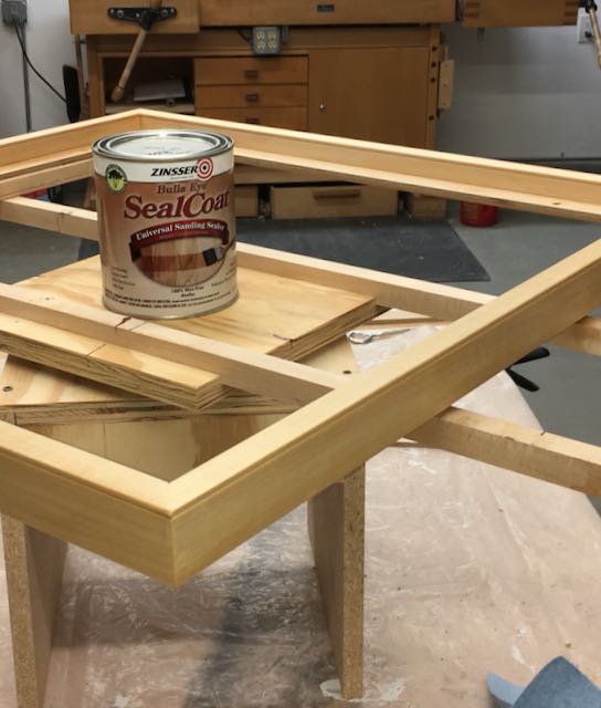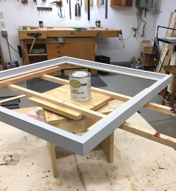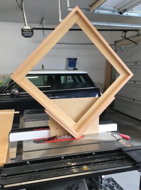 The second floater frame, also a 24″ square stretched canvas is different in that it’s made of Peruvian Walnut. This painting is titled “Break of Day”. The process is essentially the same but the finish for natural wood is different. Also, instead of using biscuits to reinforce the miters there are pieces of the walnut splined into the corners. That process is done on the table saw equipped with a rip blade and a special jig. The finish is two coats of Osmo Poly #3043.