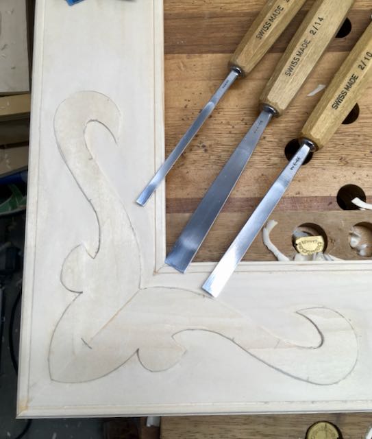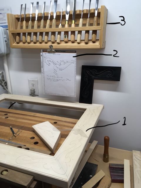 After mitering each piece, cutting biscuit slots, and then gluing/clamping the frame together it was time to work on the carving. Occasionally I’ve been asked how I go about it so in keeping with my shop teacher background I’ll share my technique. Since I’m not super artistic I rely on “borrowing” images from the internet then sizing them to the dimensions of the frame. I’ll print that out on paper and spray glue it to a piece of thin plastic to make the pattern. Best material for that is the lid from a grocery store salad container. That’s the piece by #1. To cut out the pattern I use chisels of various sweeps and sizes, choosing the tool I have that matches the design as closely as possible. I draw the pattern on another piece of paper and as I cut it out, note which chisels were used and where, that’s #2. The beauty of the plastic pattern is that it can be flipped over and get the exact match on the other side of the miter. Last of all, my rack (#3) is where the chisels are kept close at hand. Now it’s time to cut the outline and then “ground it out” from the rest of the wood. My depth for this was just under an eighth of an inch.