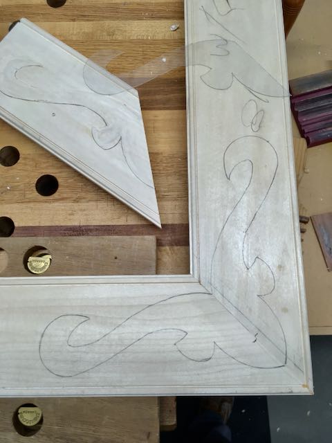 The process is this; after drawing the design on each corner the appropriate chisel is used to incise the pattern into the wood using a small mallet which you can see on the right corner of the bench. The goal is to be consistent in the depth. Once that’s competed the surrounding wood is removed to separate the design from the rest of the frame. In the pictures below you can see how I use a compass to draw a line inside of the design so that the wood can be “scooped” out creating the depth and enhancing the carving. Hand carving may display some chisel marks which is what sets it apart from the use of composition material like that produced by Bomar. Traditional red burnisher sealer was brushed onto the frame, followed by Japan Black. This was then rubbed back to expose some of the red and replicate the patina and age a frame might show that’s been around for a while. Liberon wax is used for the final finish. Here are some photographs of the work in progress to illustrate my process.