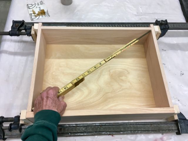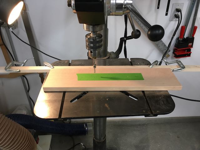 Before assembling the drawers the holes for the handles were drilled into the drawer fronts. They have 5″ centers so a simple jig was set up on the drill press to make sure they’re all located the same. The holes for the pegs that will lock the backs were also drilled before assembly. Due to space and clamps two drawers were glued up at a time. I used Old Brown Glue and allow them to dry overnight. The final step was installing the pegs for the back. This was done the next day, only needed to drill into the back piece and glue in the 3/16″ pegs which were made from Birch.
