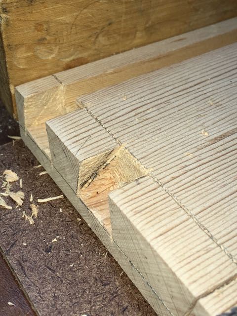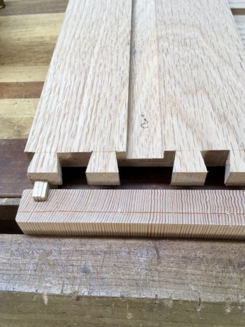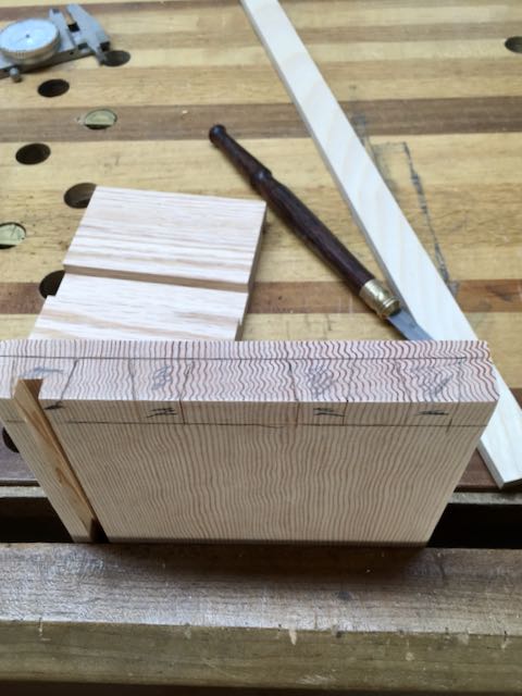 The first step to making all of the drawers was to size and shape the parts. There is a total of 6 drawers. The two piles in the lower left are the sides. They have a groove for the bottom, a dado for the back, and a rabbet for dovetails. The pile on the far right is the backs and the pile at the top are the drawer fronts which also are grooved for the bottoms. I leave everything longer than needed in case of mistakes or problems with the dovetailing and also had a couple of spares for the sides. The joinery is half blind dovetails for the fronts and pegged dowels for back pieces. I only messed up on one of the front pieces so easy enough to cut it off and make a second attempt. The grain in the Douglas Fir I is quite challenging to work with!