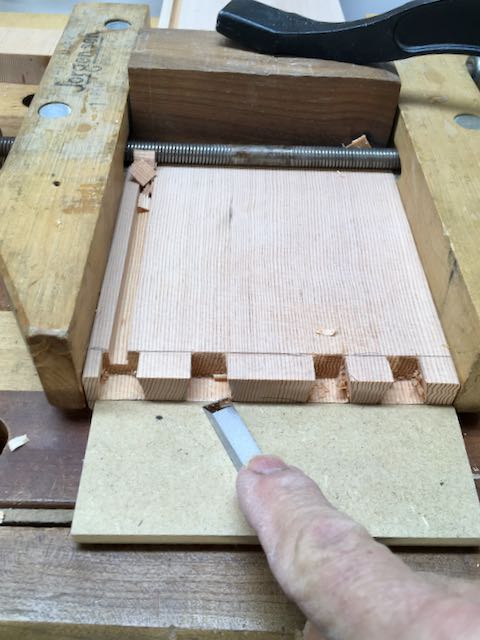 Now it’s time to begin cutting the dovetails. I follow the “tails first” method and cut the tails for both sides of the drawer at the same time. What follows is removing the waste with chisels and refining the tail. Now it’s time to cut the corresponding pins on the drawers front piece. The tailboard are carefully aligned, scribed and then cut. Your goal here is to have them fit “right off the saw” which I manage to accomplish more often than not! Volumes have been written about dovetailing so I won’t bore you with my methods. I’ll give you a pictorial summary.