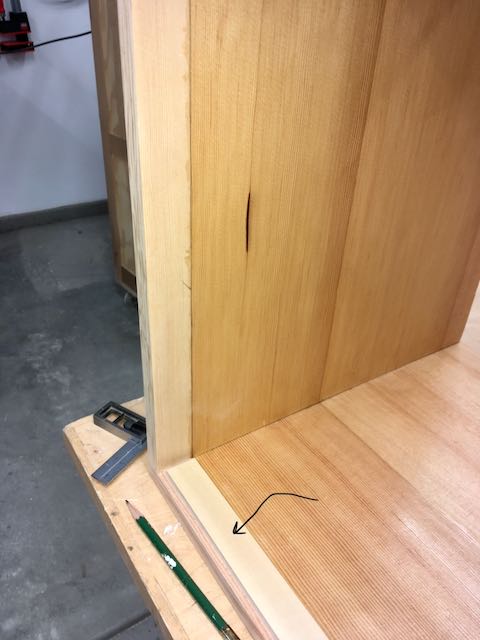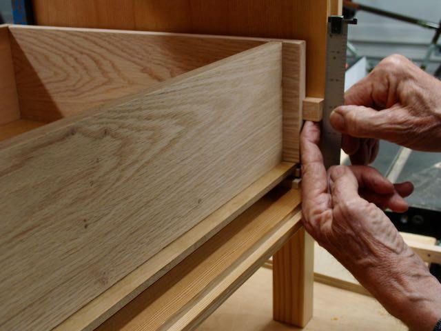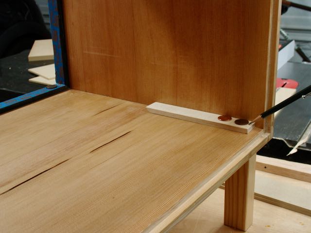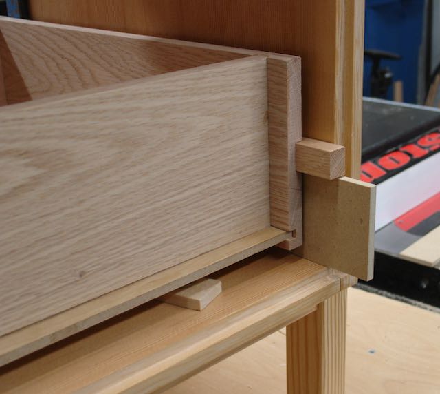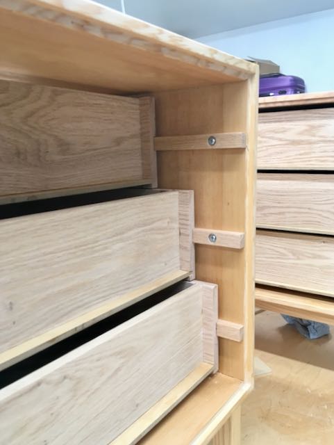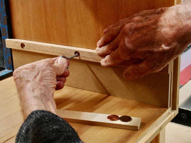 Installing the drawers is the final and critical step to this project. They are side hung on 3/4″ grooves cut in the sides. The stop is where the drawer face is dovetailed into them. Having the 1/4″ liner actually made this step easier! I know you can buy fancy jigs to install slides but I’ve always relied on a piece of 1/4″ MDF that goes from the bottom of the case to the bottom of the slide. This gives a solid base to put the slide on while you locate the mounting holes. To locate the holes I took a screw eye, pointed it on the drill press and reduced its size until it was a snug fit in the slide mounting hole. This was done with a sanding drum on the drill press. I used pennies as spacers to establish the gap between the drawers and the case. Again, I’ll let pictures and captions explain the process but if you have any questions about this method feel free to ask via the comment section. I didn’t put on the backs until the drawers were installed. The slides were already made and left slightly thicker than needed.