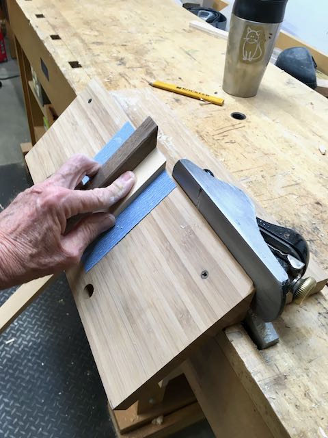 All the finishing is done and the drawers are assembled. They have been screwed to their stands and the next process is installing the liner. This is a piece of 1/4″ x 1″ Basswood, mitered, painted black and then glued to the interior. Pin nails and clamps are used to install them. I taped off that area when applying shellac to the interior so the glue would stick. Pictorial process below: