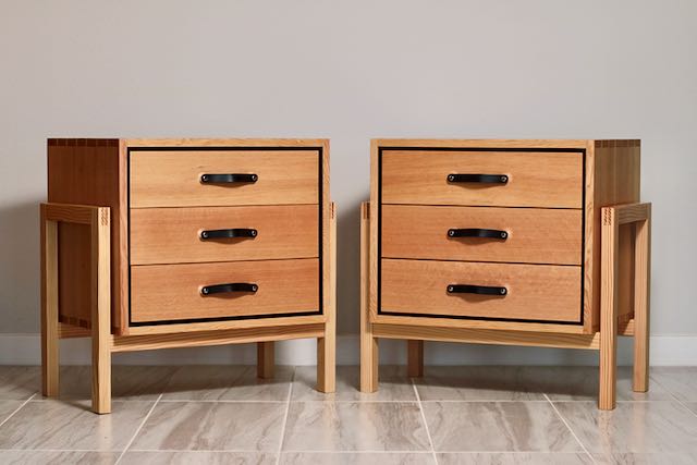 After the drawers were installed the backs were attached to complete these cabinets. Bees wax was applied to the runners and grooves. I found a place in on-line that had these beautiful leather pulls and were made in the USA! They are Makeline Designs and they are beautiful! The leather is soft and I choose the aluminum discs which gleam — very happy with their product and quick service. I’ll leave you with one more shot of these night stands; I’m very happy with how they turned out.