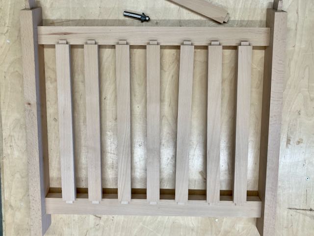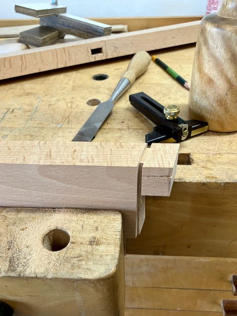 The joinery for the back supports that connects the legs together was next followed by laying out the locations for the back slats. There are different designs for those but I decided to make simple slats measuring 5/8″ x 1 1/4″. They have 1/4″ x 3/4″ tenons on each side and all 4 edges have radiuses. Getting the lay-out accurate took some time, my method is to do it on a piece of masking tape first and then once set I’ll lay it out on the wood with dividers. The mortises were cut on my hollow chisel mortiser and tenons on tablesaw and jig. They’ll be put into the mortises without any glue and have already been finished with Osmo #3043.