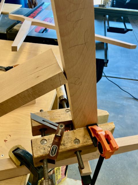 There are many seemingly minor details and decisions to be made on this project. I’ve discovered that to locate the seat, for example; the front and main leg need to be clamped together. Clamping was a problem I knew I’d have due to the angles. I found that using a parallel clamp with 150 grit paper taped to the jaws would hold securely. The clamp is tightened onto the leg to match the angle on the main leg. Then I taped a piece of wood to the top of the main leg and applied clamping pressure as close to the center of the joint as possible and it worked!
