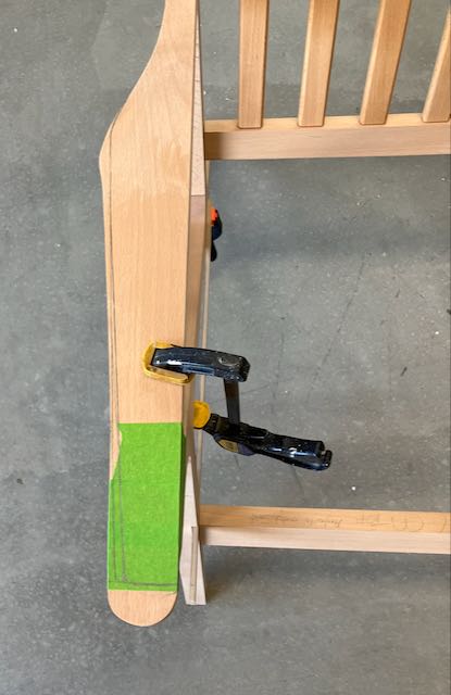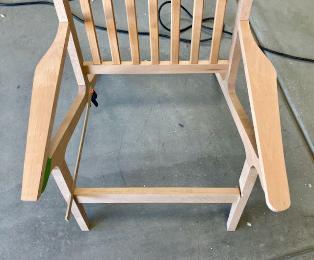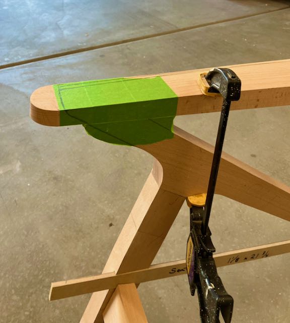 In my opinion, the thing that makes the Z-chair stand out is the way the armrest and the rest of the structure come together. At this point it’s still somewhat in progress but almost there. The original design looked more like an Adironadack with the curved ends. Now that the entire chair is assembled I can see that. I’ve found that by putting tape on the wood and drawing on that it’s easy enough to change by replacing the tape rather than drawing directly on the wood and trying to erase. I only reshaped one side and then it was used as a template for the opposite arm. Final shaping with spokeshaves is next; a step I’m looking forward to since it’s one I don’t have a lot of experience with — the new challenge!