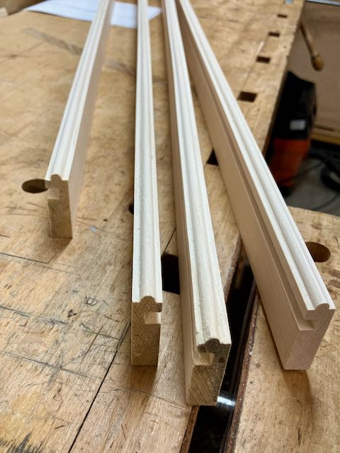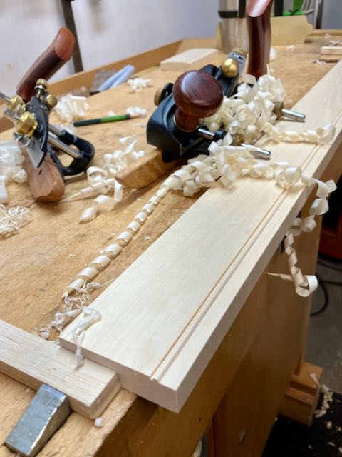 The first step on the panel was to cut a 1/8″ bead and then remove the inside material to make that bead stand proud by cutting a rabbet on it. This outlines the sight edge. The edging is first grooved and then there is a 1/4″ bead cut on the top. The challenge here is to now bring the sides of the bead down flush. Plow and rabbet plane are used. I use a Veritas small plow plane which has cutters for beads and grooves, I prefer that to a noisy router!