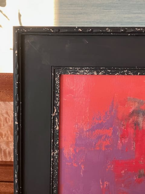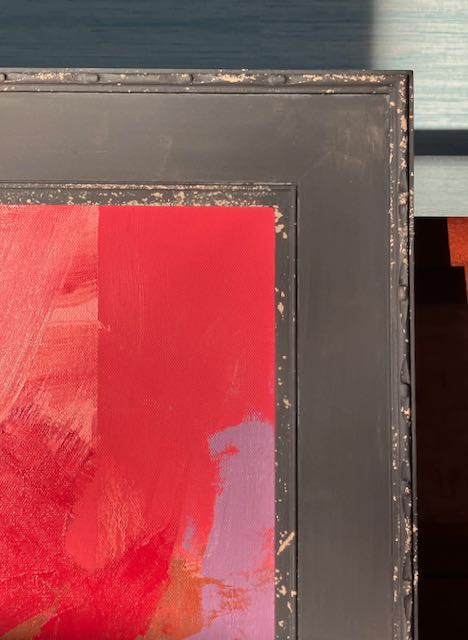 Now things get interesting! I used a white scrubby between the coats of the base color. For the top coat you don’t use that until both coats have been applied — then the magic happens! I started gently but as the Chippy material was removed the base coat was revealed. The random, hit and miss pattern of it is what adds interest to the frame. You need to seal this finish and I was told by the very helpful people at Real Milk Paint that the OSMO Polyx I use is an acceptable sealer so that’s what I used. If you check out their website there’s a lot of information about how to use their products. I’d like to experiment with mixing the colors to achieve different effects. Here are two corner samples, interesting isn’t it?