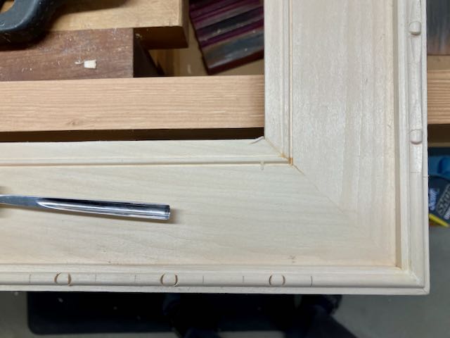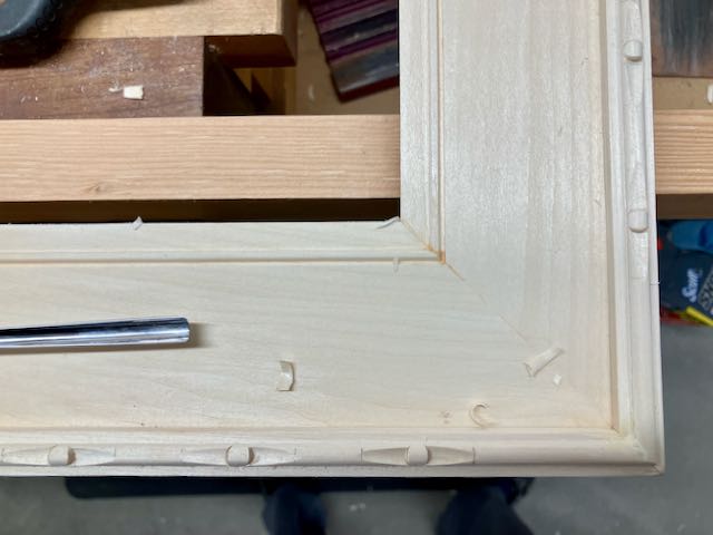 The frame was assembled in my usual method, first the miters have a biscuit slot cut and are then glued and clamped overnight. Then the edging is mitered and glued into place. For this frame I used small finish nails rather than clamping. The bead on the edging was carved as shown and it adds texture to the frame. Now comes the finish process which is a new one for me. I did a few sample pieces and learned that it’s somewhat unpredictable. Authentic milk paint comes in powder form which you mix with water. Ready made milk paint that you can buy in a can is not the real deal!