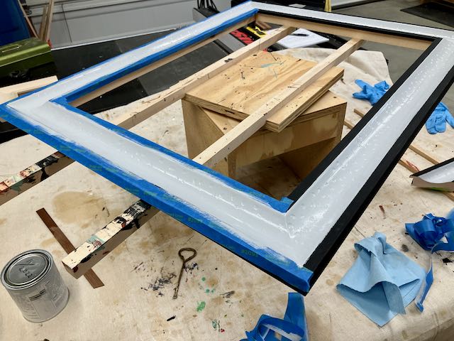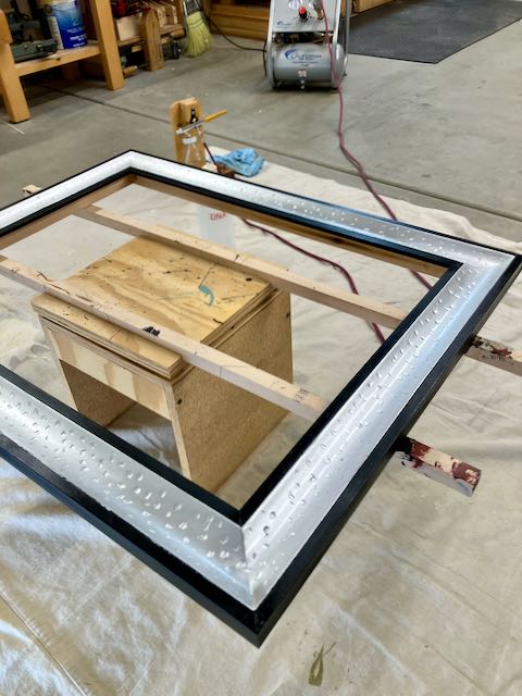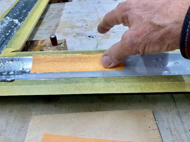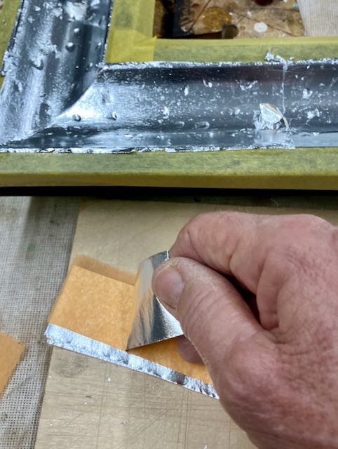 The finishing process was a succession of first taping off the cove to apply the Japan Black to the edges. When that was dry, the edges were taped off to apply the gray sealer/burnisher. That tape was removed and replaced with the yellow 3M tape prior to applying the slow set size and the laying metal, silver leaf. I’ve found that the yellow tape leaves a cleaner edge since it’s thinner. When I lay composition leaf I use my fingers and cut it to size with a single edge razor blade. I’ve found that if you press firmly down on 6 or so leaves and cut them on a piece of plywood they cut cleanly. This is much, much easier than handling them with a gilders knife on a pad. With this cove I was actually able to pick up the leaf and paper at the same time and use similar to how patent leaf is applied. I’d do one side of the cove first and then come back to do the opposite side.