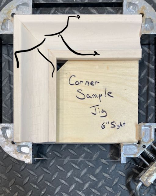 After cutting the rabbet I also cut a slight, 30° chamfer on the outside, back edge of the molding. This makes the frame appear to float away from the wall. A skew rabbet plane was used to form a shallow, flat area on both sides of the cove, I’ve marked those areas in the picture. These outline the cove and give a definite edge to separate the black Japan paint from the cove. Makes it easier to tape too! Lastly, the pieces were mitered, biscuit slots cut, and then glued/clamped overnight. I usually make a sample corner for new designs and you can see the details of the frame in it.