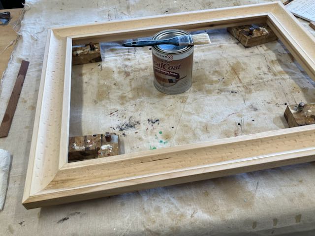 After assembly it was time to start texturing the coved area. I experimented with different gouges and decided to use a #7 sweep that was 10mm wide. This particular gouge had a long bend to it which made it easier to get to all areas of the cove. Do you realize how difficult it is to develop a truly random pattern? After doing a section I’d step back and look at it, then try to decide if there was a pattern or if there were too many or not enough cuts, do I need more, should there be less, etc. Finally I decided to listen to my daughters favorite phrase: “it is what it is” and let it be. The entire frame was checked over, sanded as needed and then I brush on a coat of Zinsser shellac seal coat to all surfaces which is lightly sanded with 400 grit paper before the final finish.