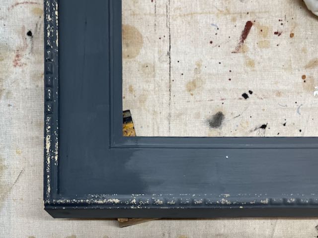 The painting this frame was created for is titled Shop Girl, it’s oil on stretched canvas, measures 24″ square, and was painted by my wife Diane Eugster. After the base coat was applied it was scuff sanded with 320 paper. No sanding between the top coats as that would probably remove some of the Chippy material. I did lightly scuff sand the final top coat with a white, nylon scrubby before rubbing on two coats of the OSMO Polyx 3043 satin. My goal was to expose enough of the top coat to replicate some aging but not so much that it’d look like a beat up old frame. The base coat compliments that light vertical detail near the center of the painting while the final coat mimics the shop girls skirt. That’s what makes a frame truly custom.